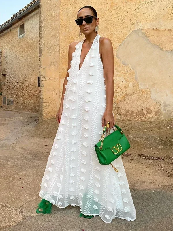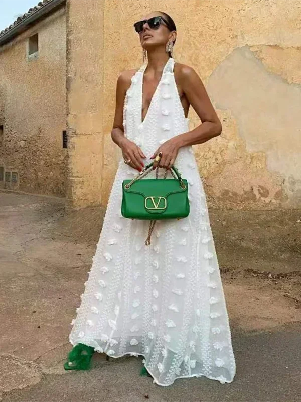 Robe longue blanche femme avec col halter et détails floraux légers, idéale pour des occasions estivales.