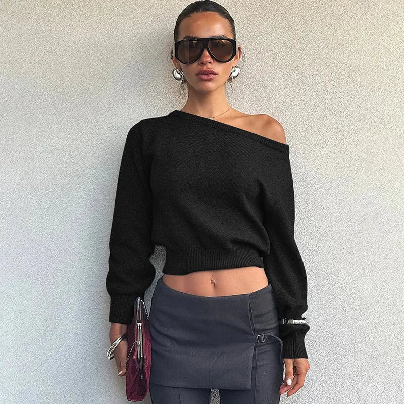 Pull noir à une épaule pour femmes, en tricot, style décontracté pour l&