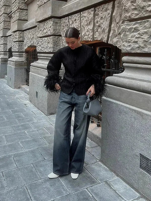 Women's black jacket with elegant feather cuffs