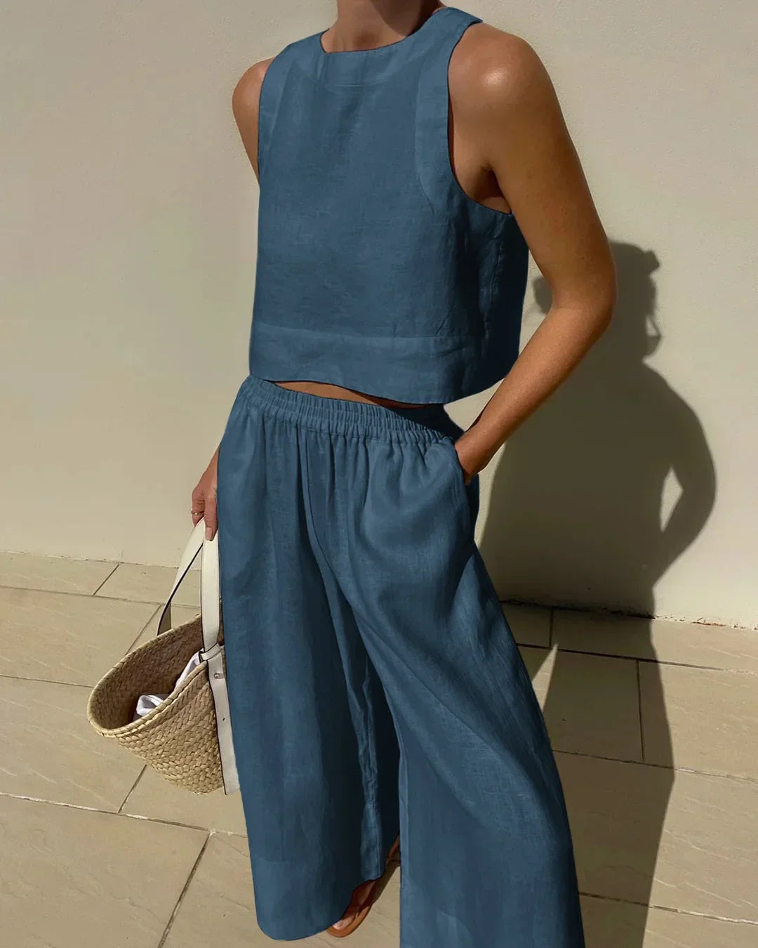 Ensemble femme sans manches en tissu léger, avec un top court et un pantalon fluide, parfait pour les journées estivales.