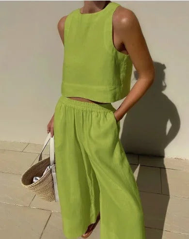 Ensemble femme vert sans manches, avec top court en coton léger et pantalon fluide à taille élastique, parfait pour l&