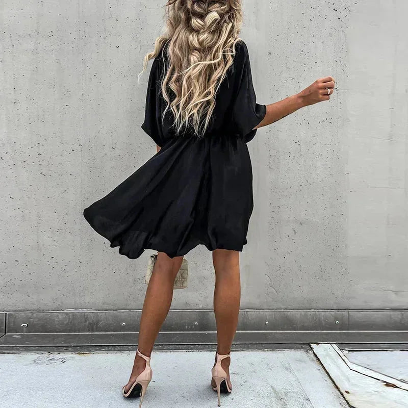 Robe courte fluide en viscose, col V, cache-cœur, manches courtes, coupe ample idéale pour les journées d&