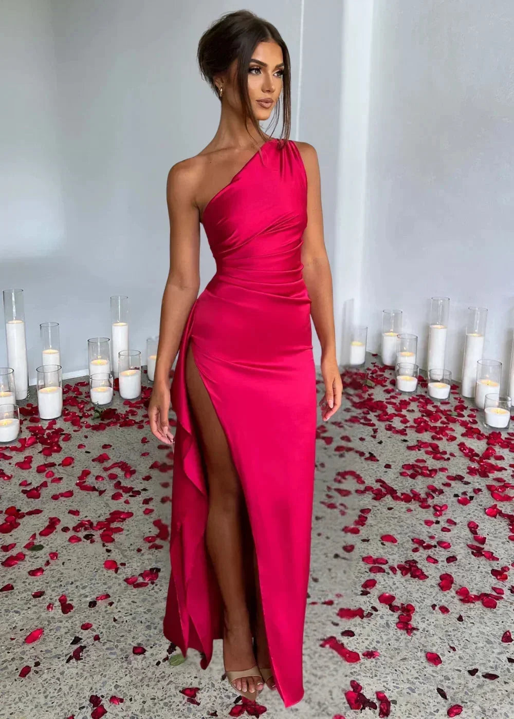 Robe maxi fendue à une épaule en tissu léger rose foncé, idéale pour les journées ensoleillées et les soirées estivales.