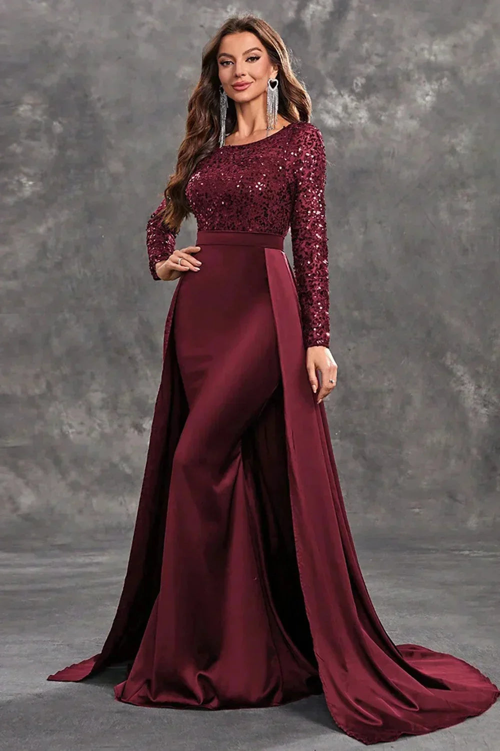 Robe soirée longue en Bourgogne, fabriquée en satin, ornée de sequins, avec une jupe fluide et élégante pour une allure chic.