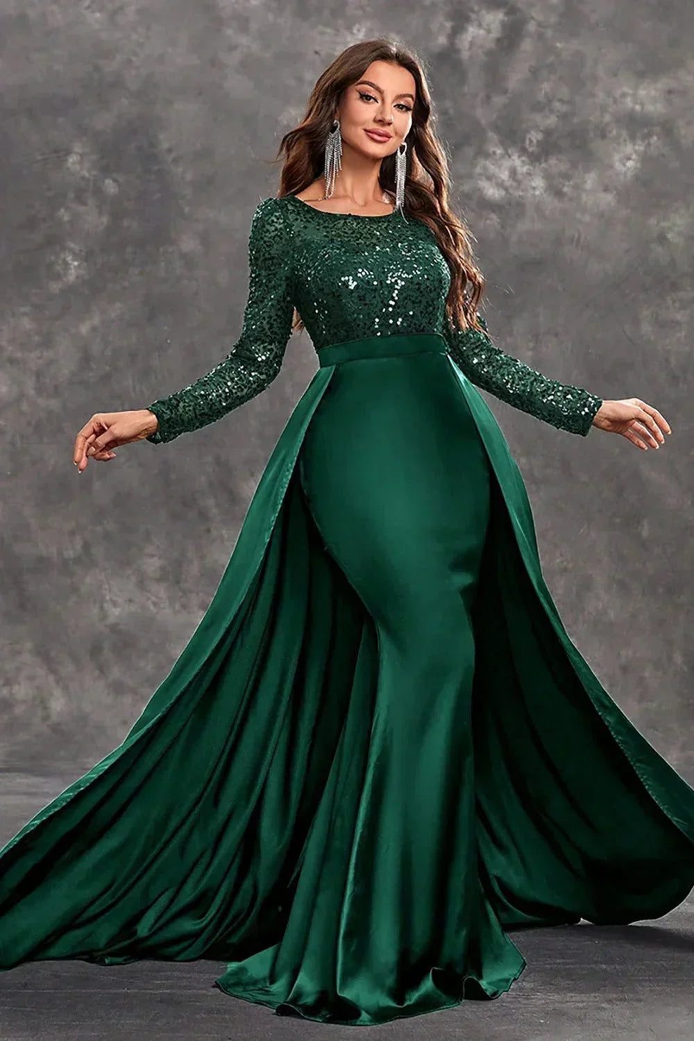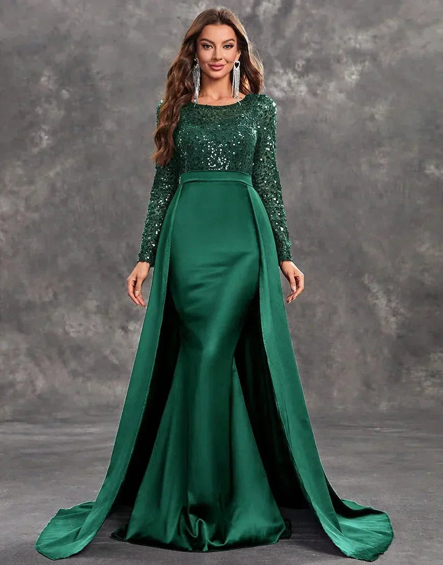 Robe soirée longue verte en satin avec sequins et jupe fluide, parfaite pour des occasions spéciales.