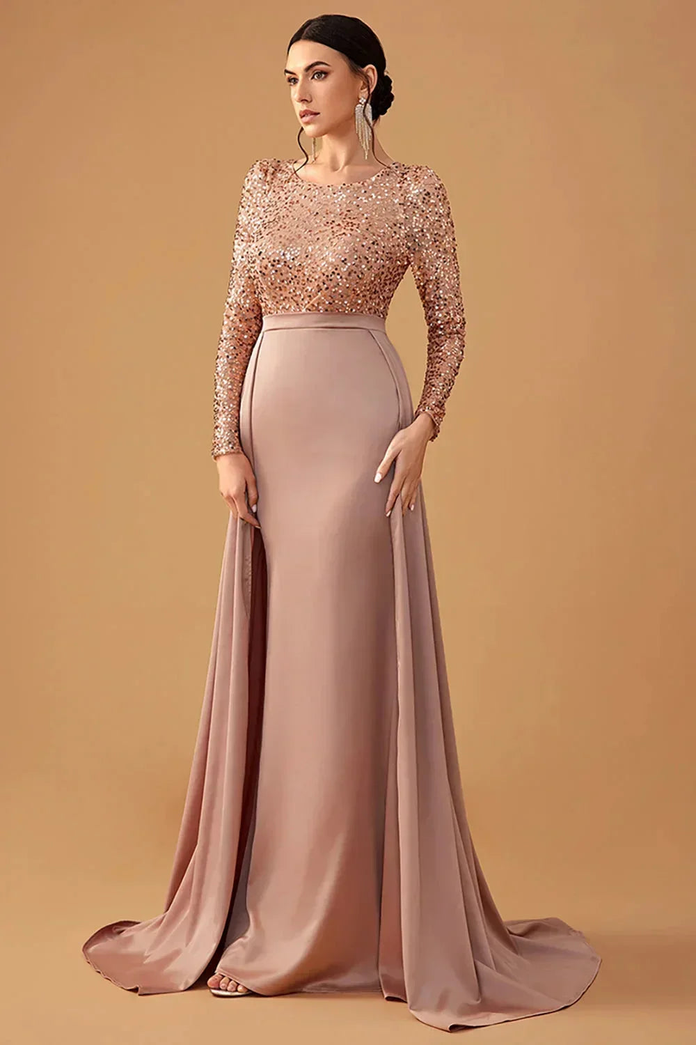 Robe soirée longue en satin, ornée de sequins, avec une jupe fluide et élégante pour un look sophistiqué.