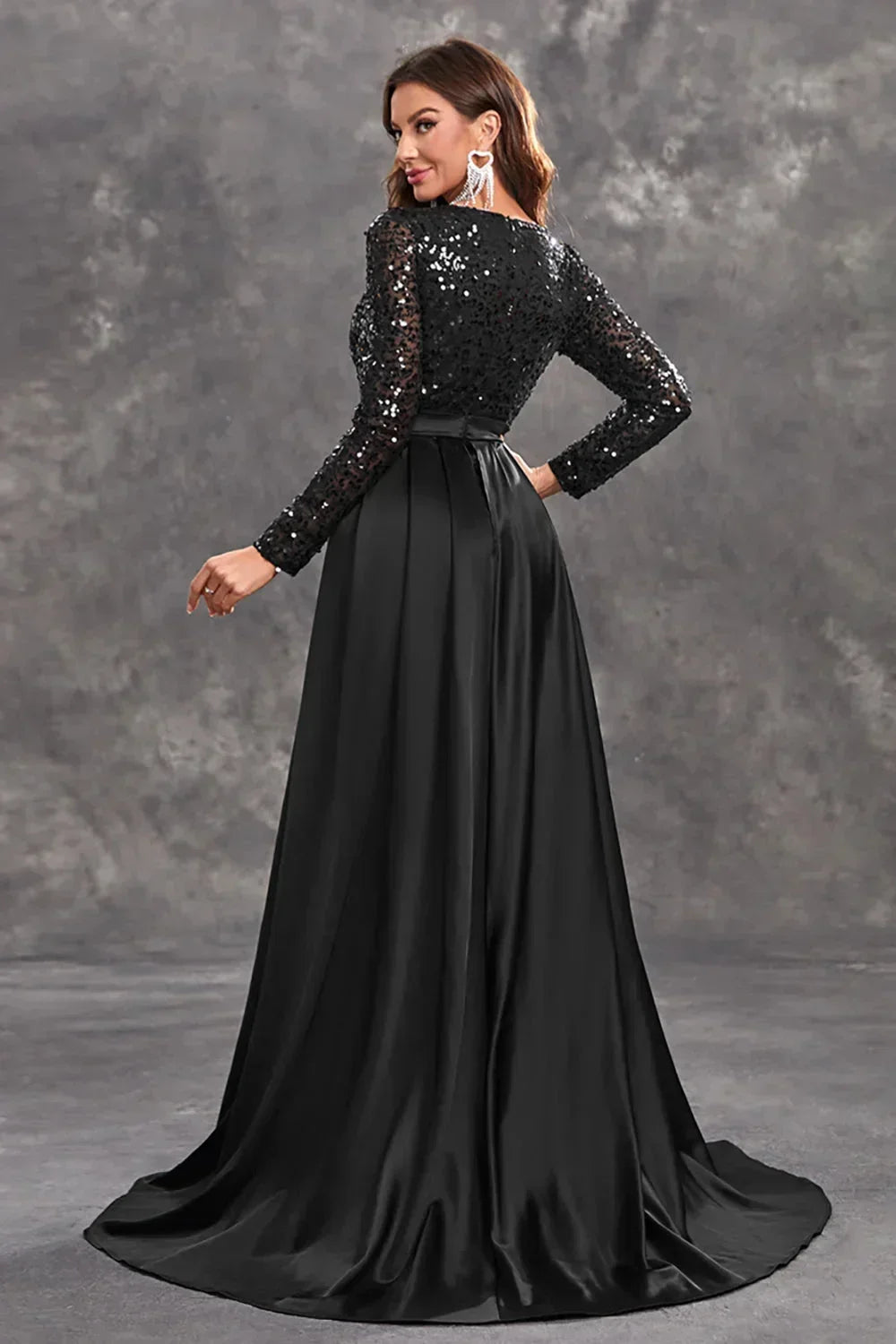 Robe soirée longue en satin avec sequins brillants et jupe fluide, idéale pour les occasions spéciales et les événements.