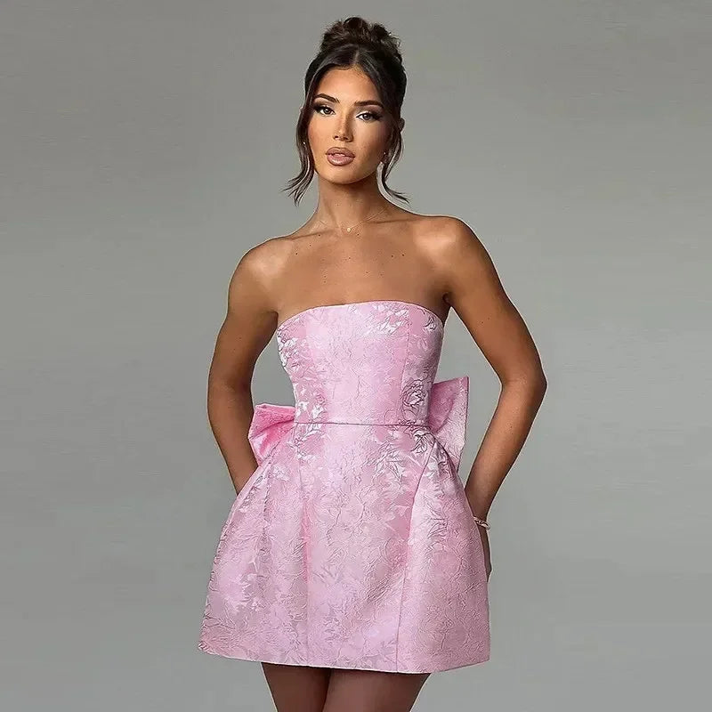 Robe courte rose pour femme, bustier ajusté, dos lacé et nœud, en tissu léger pour un look élégant et flottant.