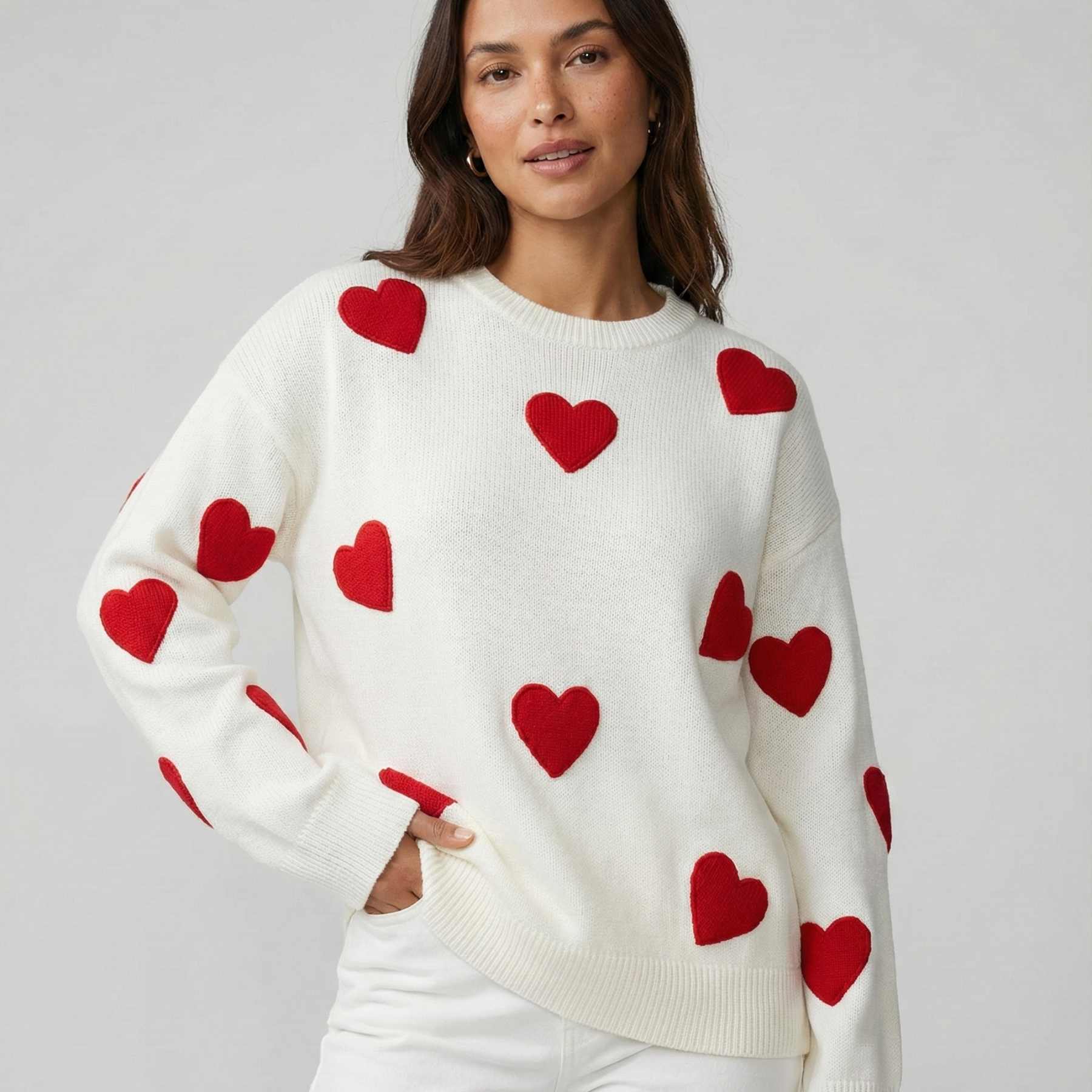 Pull décontracté femme blanc avec motif cœur rouge, en coton doux, adapté pour les occasions décontractées.