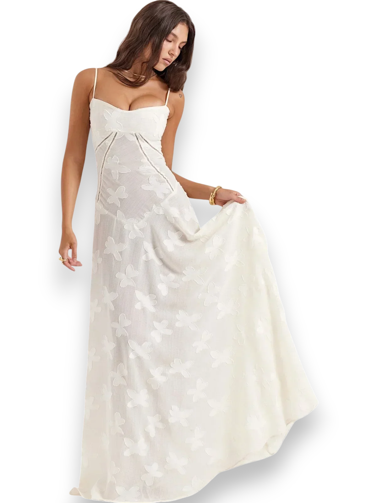 Robe longue en tissu léger, broderie florale délicate, bretelles fines et coupe fluide, idéale pour les occasions estivales.